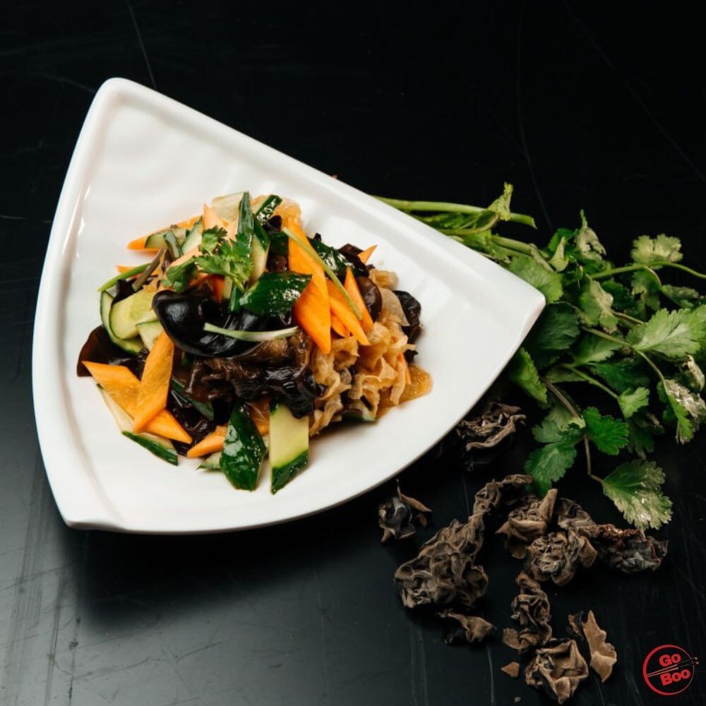 Микс древесных грибов, морковь, свежий огурец, соус
